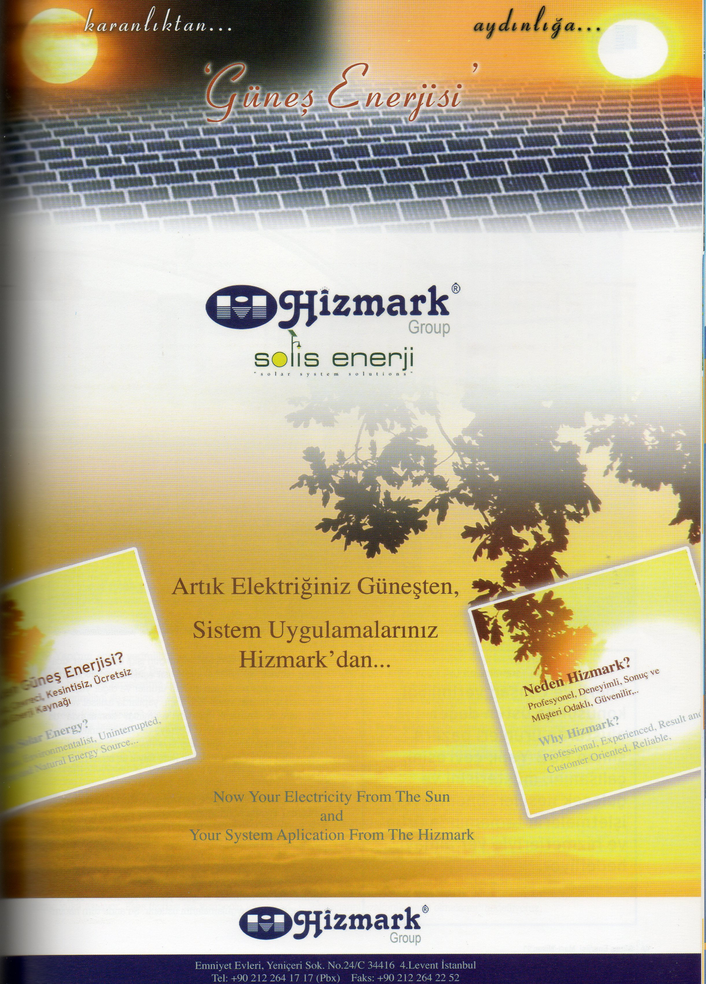 Hizmark Group şirketlerinden Solis Enerji kurulduğu günden itibaren güneş enerjisi uygulama çalışmalarında birçok başarılı projeye imza atarak, ülke ekonomisine çok büyük katkı sağlayacak bu sistemin Türkiye’de de yaygınlaşmasını sağlamak için çalışmalarına devam ediyor.